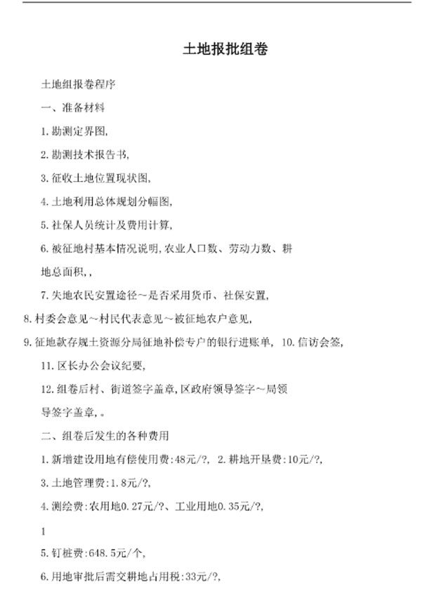 士地报批中,组卷报批通常指的是将有关土地使用的多个问题、文件、资料等组成卷宗,然后向上级或相关部门进行申报和审批。这个过程包括了对土地使用范围、界限的测量和确定,对土地性质和权属的调查和确认,以及对土地使用计划的编制和审批等